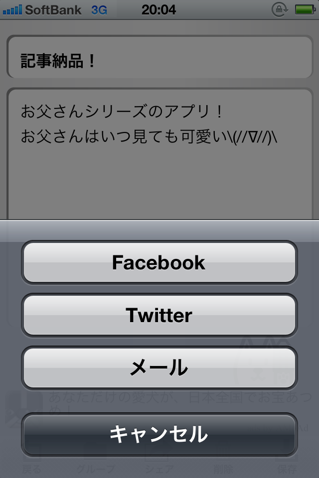 「シェア」をタップでTwitterやFacebook、メールで共有できるよ