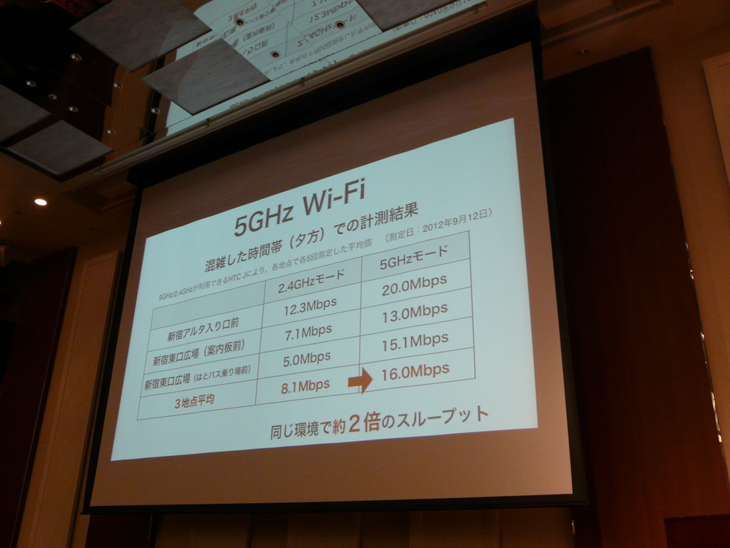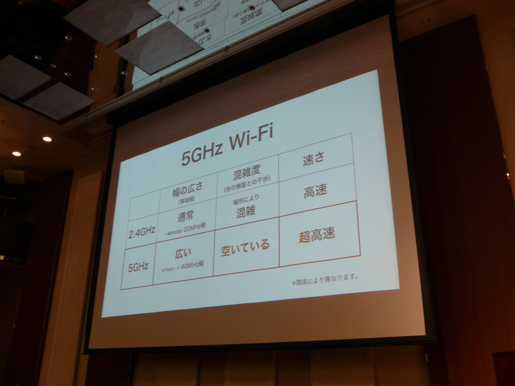 2.4GHz帯は、モバイルルーターの普及や、公衆無線LANスポットの乱立、Bluetoothや無線キーボード・マウスが同じ帯域を使っていることなど、いろいろな要素が相まって快適な通信ができないことが多くなっています。5GHz帯であれば、利用者がまだ少ないことや、帯域をより広く取れる(IEEE802.11nでの一定速度以上の高速通信は5GHz帯限定)ことから、石川氏は「実測でも非常に高速にお使い頂ける」と、自信を持って語っていました。