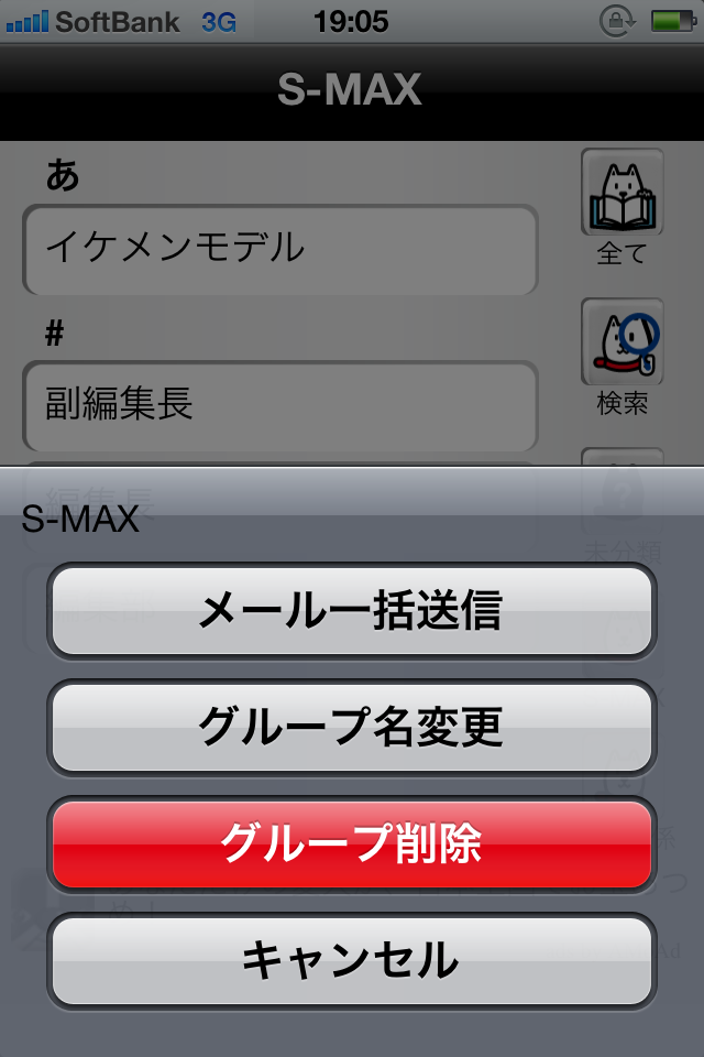 見た目もスッキリな白ベースの電話帳になっています。残念ながらグループの順番の入れ替えはできませんが・・・。