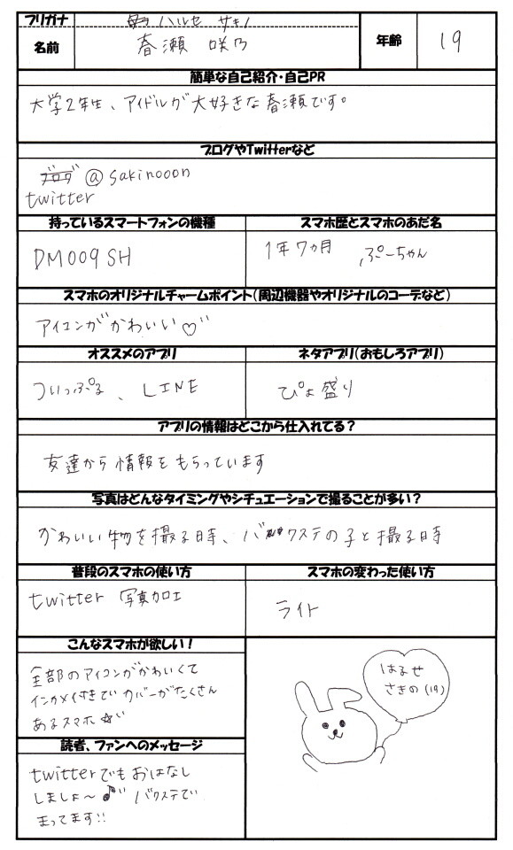 第一回目の広沢麻衣(ひろさわまい)さん、第二回目の橋本ゆりあ(はしもとゆりあ)さんに続いて、第三回目は春瀬咲乃(はるせさきの)さん(19)です!ディズニーとアイドルが大好き!という春瀬さんが普段愛用している「ディズニー・モバイル・オン・ソフトバンク(Disney Mobile on SoftBank)」の「DM009SH」(シャープ製)についてチェックしていきましょう!