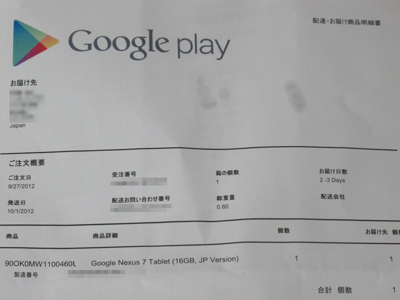 また、Nexus 7の納品書(お届け明細)には「nexes7 Tablet 16GB,JP Version」と書かれていました。