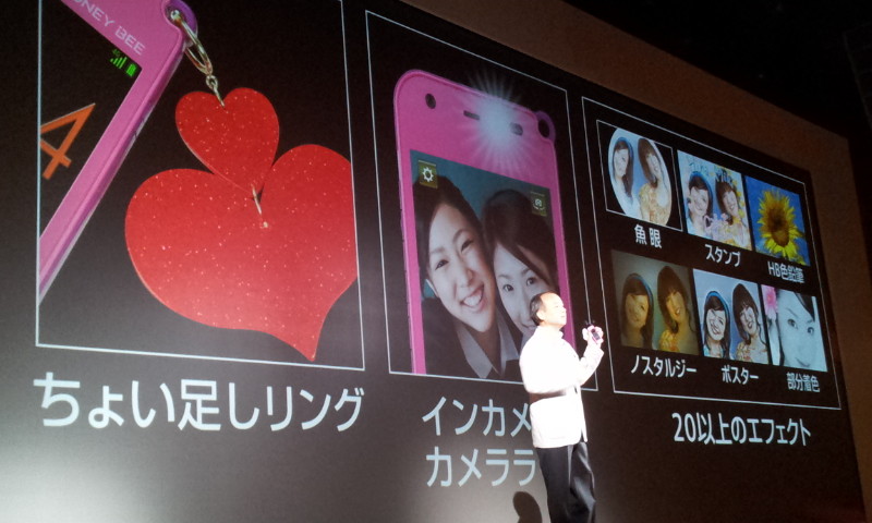 SoftBank 4Gなどハイスペックになったほか、端末上部の「ちょい足しリング」に飾りをつけて自分だけのスマートフォンにアレンジ可能だったり、自分撮り用のインカメラに約200万画素の高画素カメラだけでなく、インカメラ用ライトも搭載したユーザーニーズに応えたモデルとなっています。