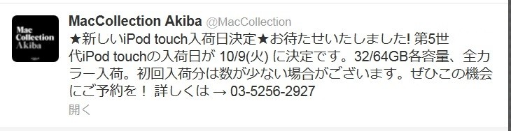 ソフマップのApple専門店「MacCollection Akiba」でもTwitterやHPで新モデルiPod touch/iPod nanoの発売を開始したと掲載しています。