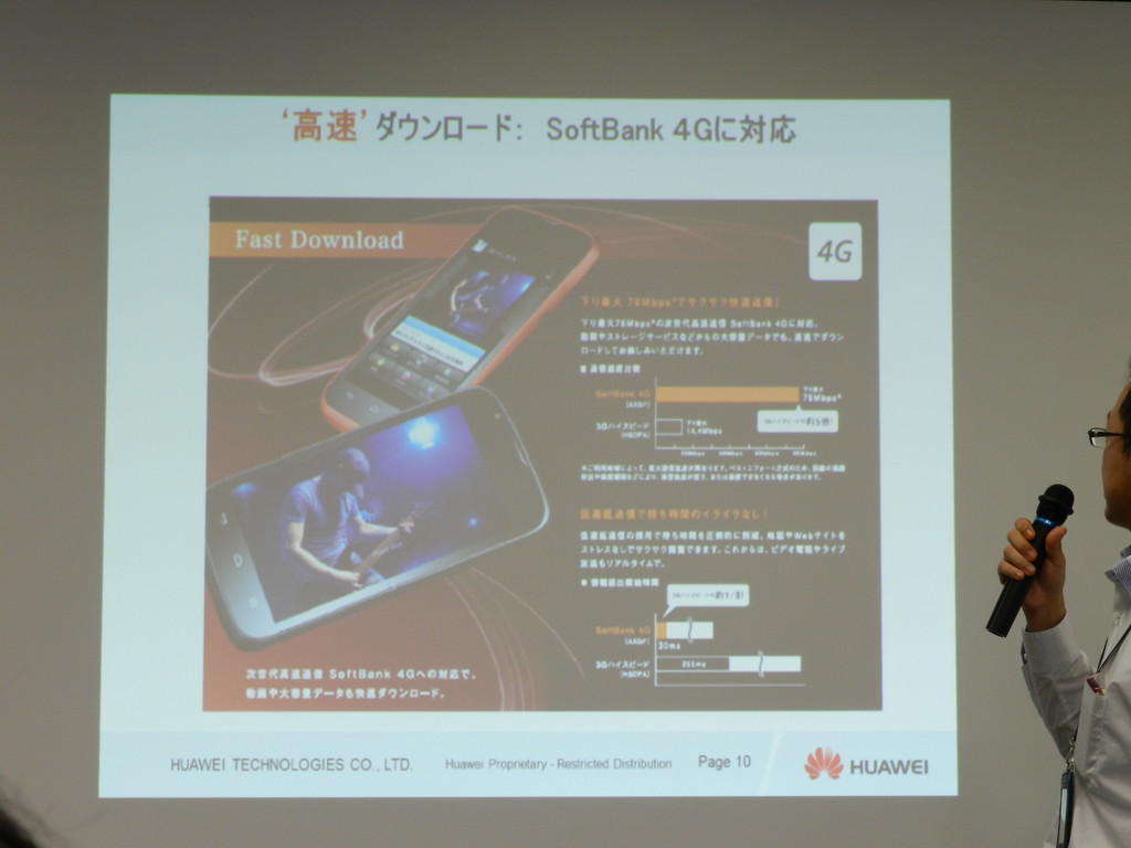 ソフトバンクが展開する高速モバイル通信サービス「SoftBank 4G」に対応する端末の中でいち早く体験することができるSTREAM SoftBank 201HWは「高速ダウンロード」「高速オペレーション」「高速カメラ」「高速ブラウザ」の4つの“高速”を実現した端末に仕上がっていることについての紹介がありました。