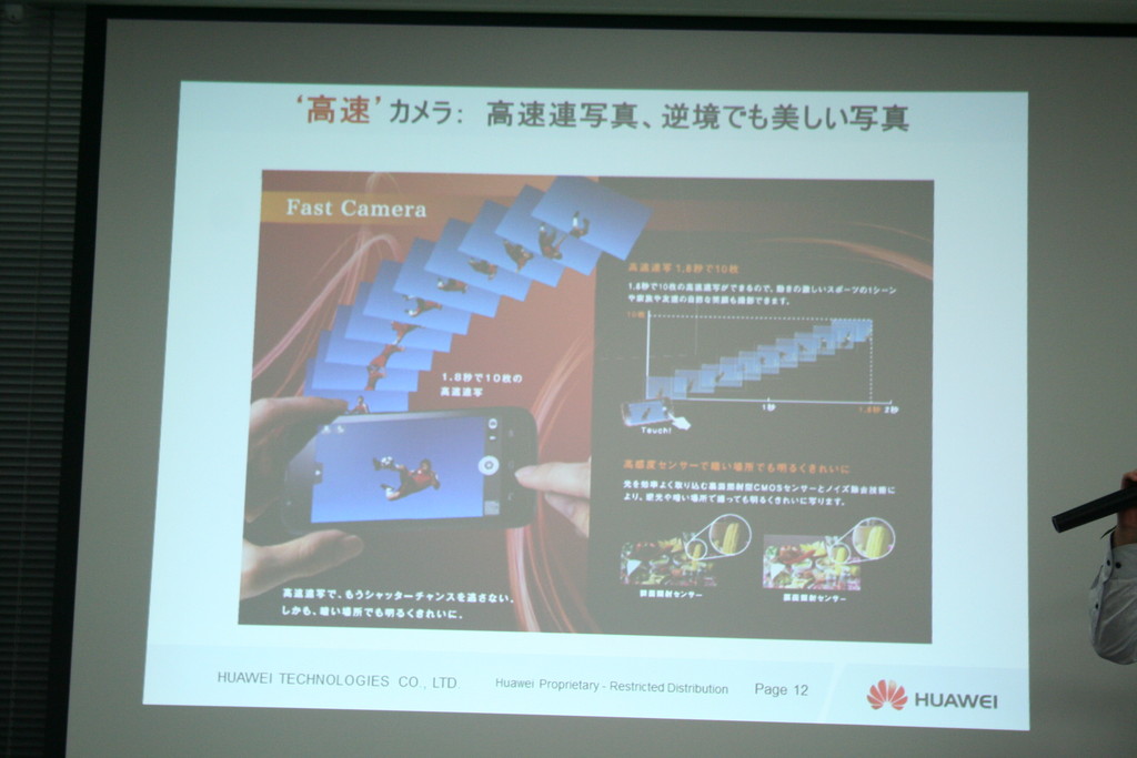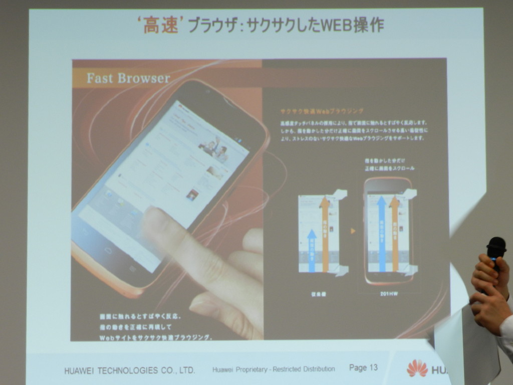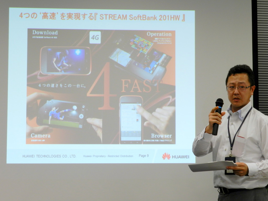国内メーカーとの違いを交えつつ、これまでに発売されたファーウェイ製品を振り返ってのワンポイント解説と新製品STREAM SoftBank 201HWのポイントや操作方法などのレクチャーがありました。
