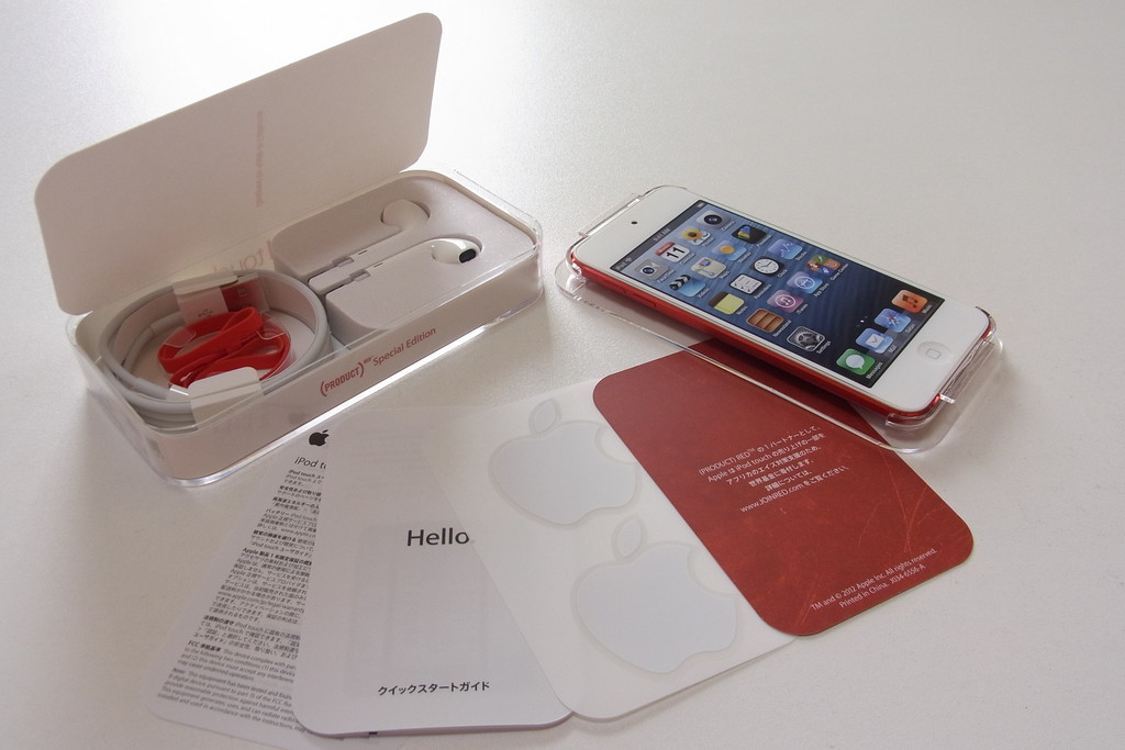 本体を取り出すとクイックスタートガイド、アップルスッテッカー、(PRODUCT) REDにだけ同梱される売上の一部をアフリカのエイズ対策支援のため寄付される内容が記載された赤いカード、iPhone 5同様のEarPods、小さく新しくなったLightning、iPod touch loop(ストラップ)が同梱されています。