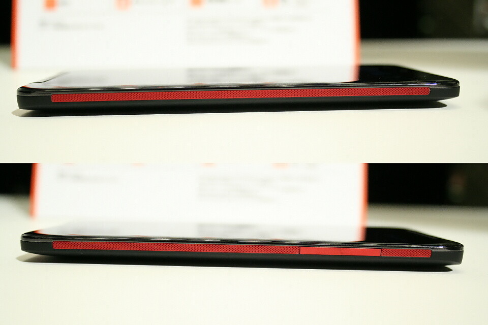 さらに重ねてみると、HTL21の大きさがよく分かった。HTL21は全体のサイズは大きくなったものの、厚みは約1mmほど薄くなっており、側面を比較するとその薄さがよく分かる。