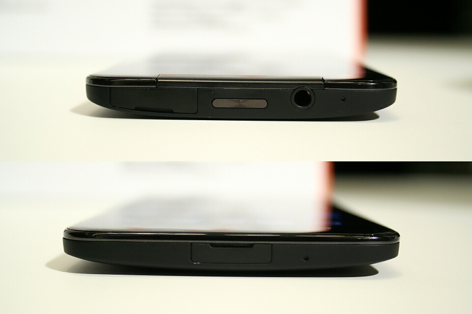 また、上部側面のau ICカードスロットとmicroSDカードスロットは2段重ねの仕様となっており、スロット横の丸い穴に専用のピンを挿し込んでau ICカードを取り出す仕様に変更し、iPhoneのSIMカードを取り出すタイプに似ている。