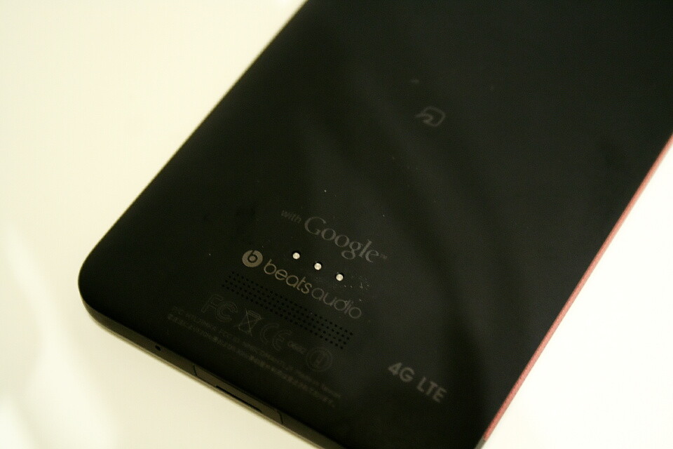 背面のメインカメラは約800万画素のCMOSを搭載。カメラ周辺にはライトと赤外線通信ポートを実装する。背面の下部にはスピーカーを搭載、「ビーツオーディオ」のロゴや「4G LTE」のロゴも見える。また、背面にはFeliCaポートを備えており、おサイフケータイにも対応し、さらにNFC(Near Field Communication)にも対応している。