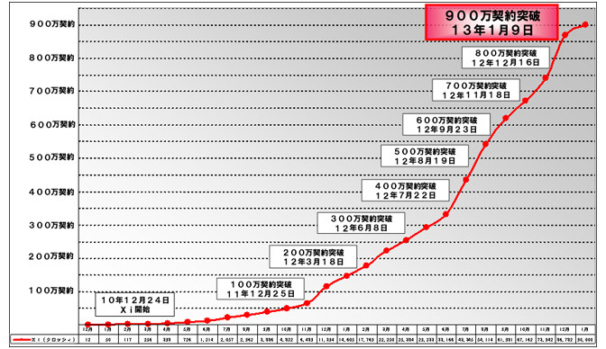 ドコモが公表している契約数の推移によると、2012年の7月以降は、ほぼ1ヶ月単位で100万契約を上積みしており、2012年12月16日に800万契約を突破した後は24日間でさらに100万契約を獲得し900万契約を突破した。