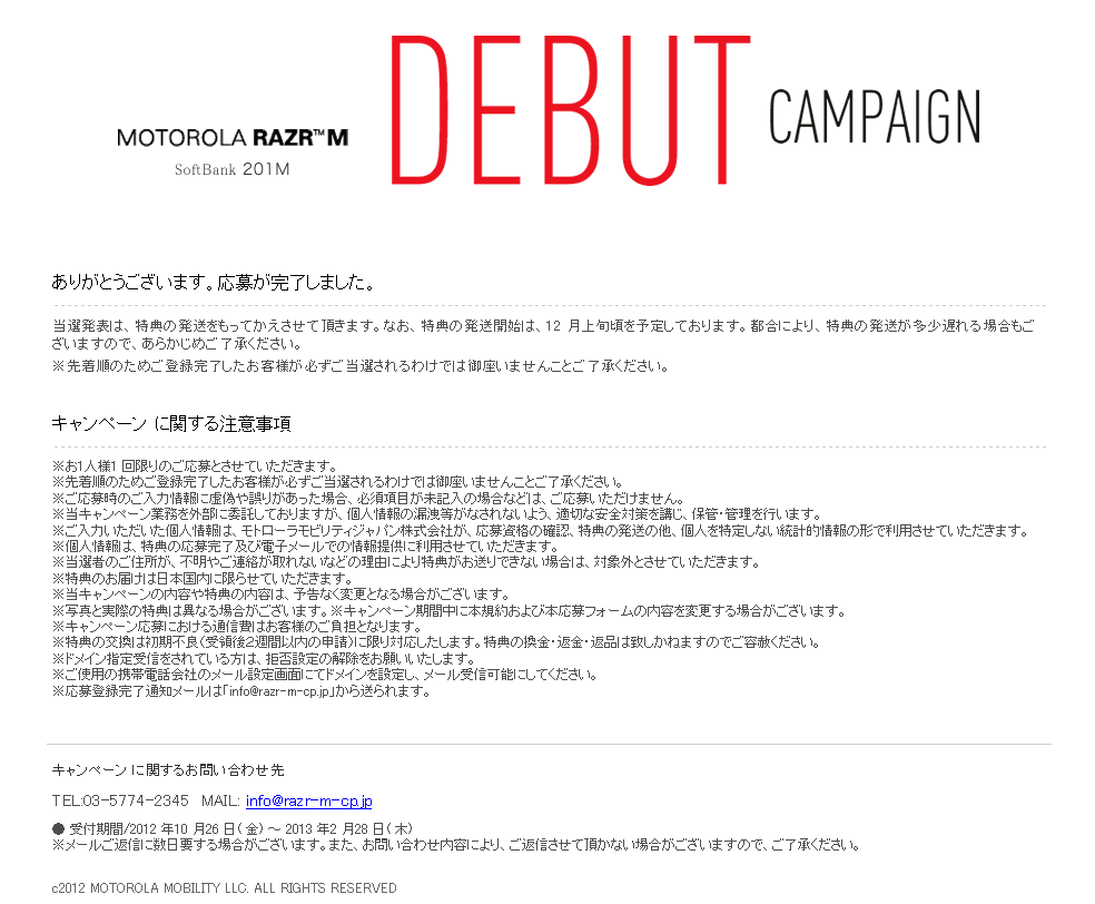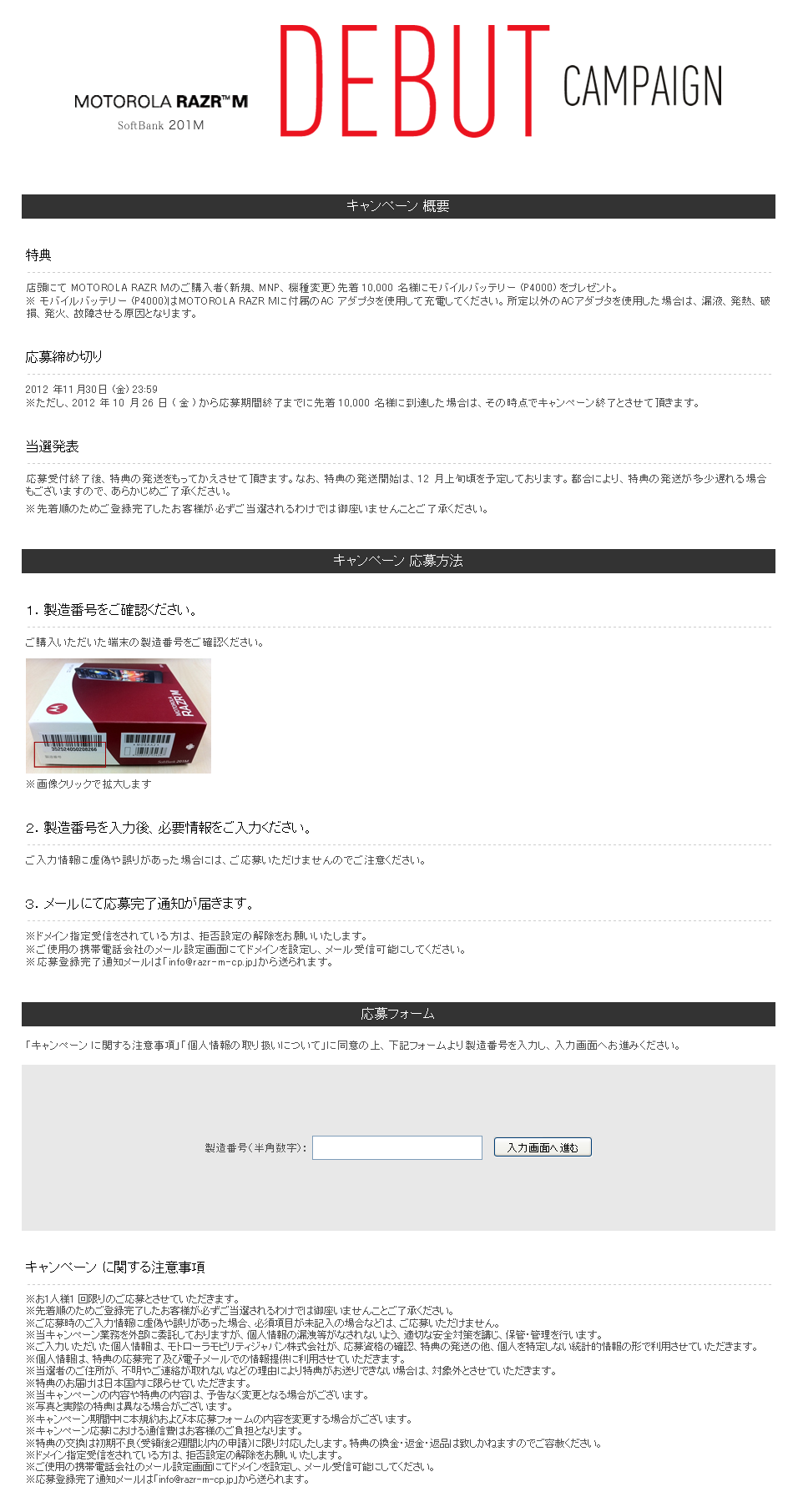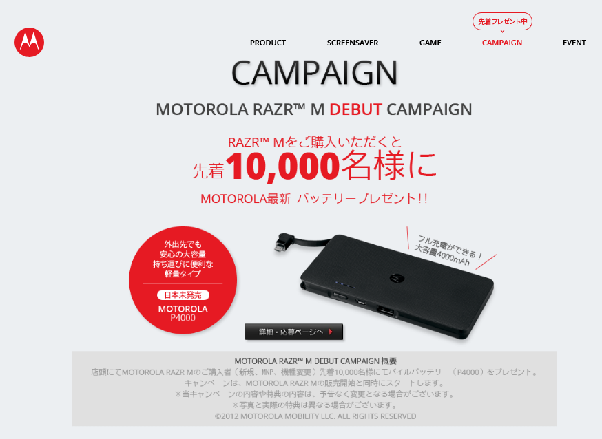 こちらの記事でもお伝えしたように発売と同時に特設サイト「:: MOTOROLA RAZR M / SMARTPHONE スマートフォン ::」で、モバイルバッテリーキャンペーンを行っている。当然筆者も申し込んでみたので、キャンペーン概要と応募方法を紹介してみる。