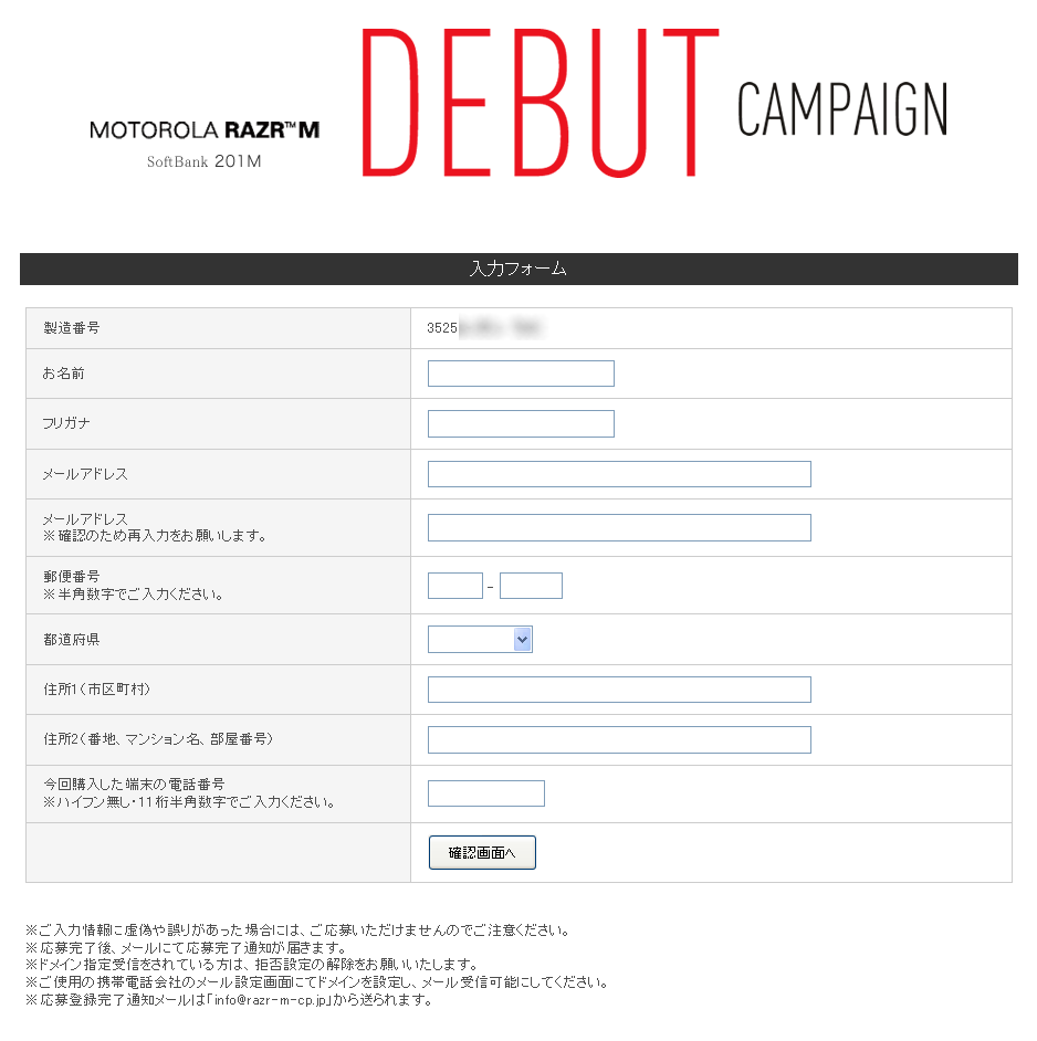 応募については、まずキャンペーンページにアクセスして「詳細・応募ページへ」をクリック、推移した詳細画面でプレゼントの詳細な内容や注意事項などに一通り目を通しておく。このページで購入した201Mの製造番号(IMEI)を入力して「入力画面へ進む」をクリックする。