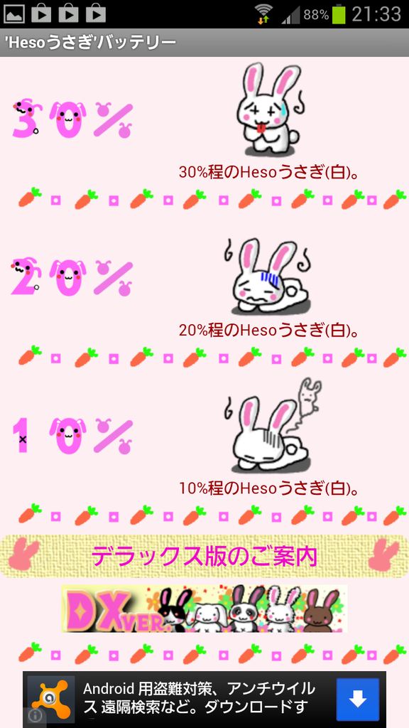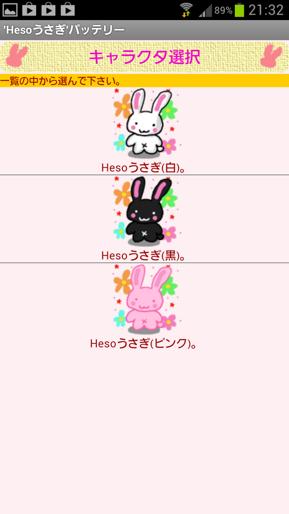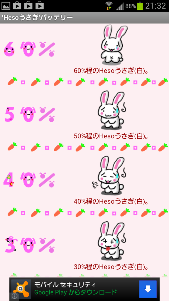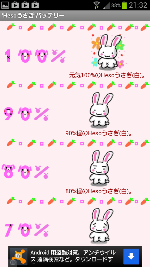 今回紹介するAndroid向けアプリはうさぎさんがバッテリー残量を教えてくれる「Hesoうさぎバッテリー」です!