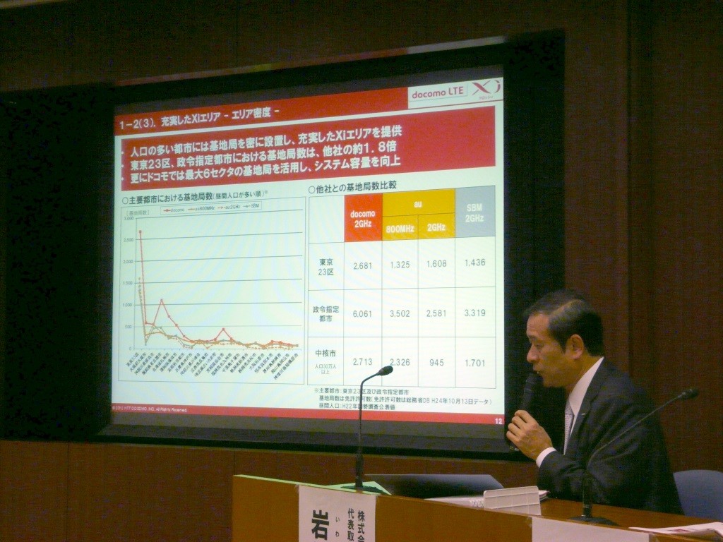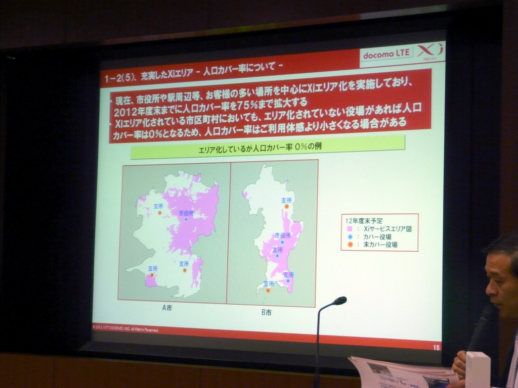 今回の説明会では、ドコモとしては珍しく、基地局数と、人口カバー率についての資料を用意していました。他社比較、というとソフトバンクモバイルがよくやる手法で、最近はKDDIも他社比較をやるようになっています。ドコモが他社比較をするのは、自分の経験上、これが初めてです。これも、ある意味、ドコモの焦りというか、他社の戦略勝ちなのか…。