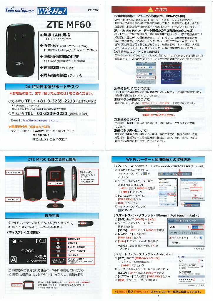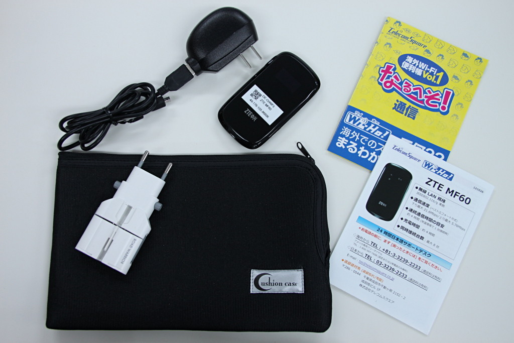 さてそれでは機器一式を紹介しましょう。今回レンタルされたモバイルルーターはZTEの「MF60」という機種。2G/3Gに対応し、通信速度は下り最大21.6Mbps/上り最大5.76Mbpsとされています。