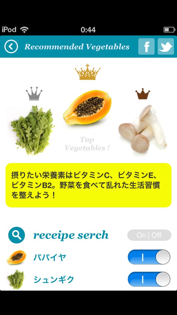 そこで、今回紹介するiPhone向けアプリは摂りたい、摂らなければいけない栄養をたっぷり含んだ野菜を知り、美味しく食べてコンディションを整えてくれる野菜が分かる「vegeyourself」です!