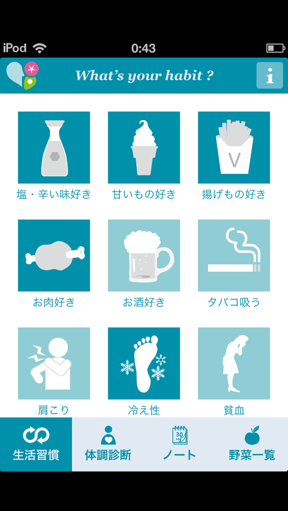 次に、「体調診断」で今のコンディションを選びタップしていき「Checkup」をタップするとオススメの野菜が表示されます。
