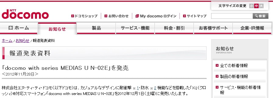 ・報道発表資料 : 「docomo with series MEDIAS U N-02E」を発売 | お知らせ | NTTドコモ
