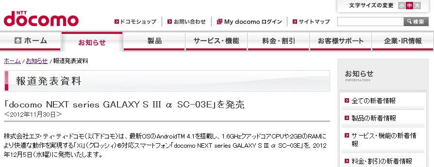 ・報道発表資料 : 「docomo NEXT series GALAXY S III α SC-03E」を発売 | お知らせ | NTTドコモ