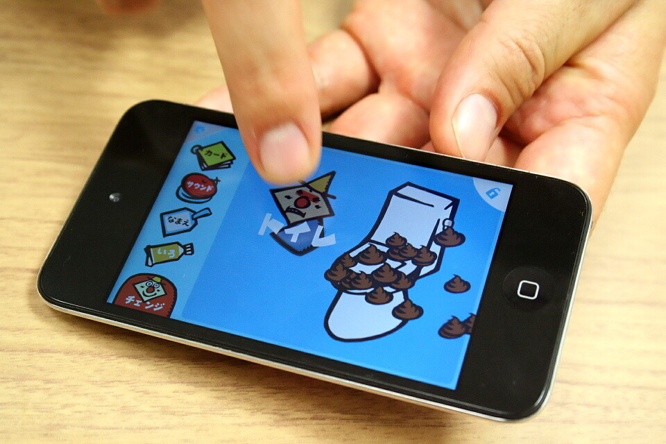 あとは、「Mr.shapeのタッチカード」というアプリで、画面をタッチして遊ぶことができる色んな“カード”があるアプリです。例えば、このトイレのカードだと、タッチするとうんちがいっぱい出てきて、トイレに流すという感じですね。アプリ自体は無料ですが、このカードを追加する時は有料で、何枚かカードを追加してますね。子供は今でもこれで遊んでいます。