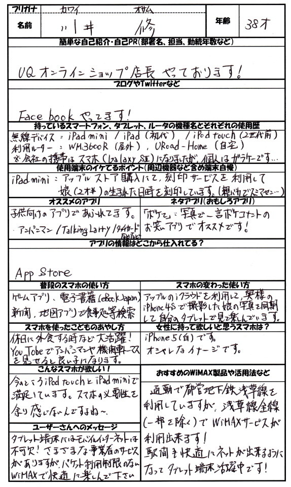 川井さんは「UQ WIMAX オンラインショップ」の店長に加え今月5日からサービスインした「UQオプションストア」も担当しています。愛機の壁紙には子供の写真を設定、2歳7ヶ月の娘さんがいるイクメンでもあります。