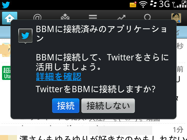 「Twitter」も「Facebook」と同様に「BlackBerryMessenger」との連携が可能です。これにより、複数のSNSをひとつのアプリで一元管理できるようになります。