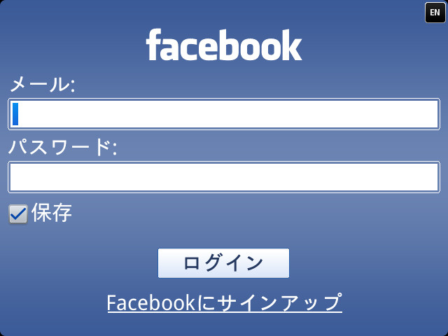 まずは「Facebook」。アプリを起動すると、いきなりログイン画面となります。メールアドレスとパスワードを入力してログインします。