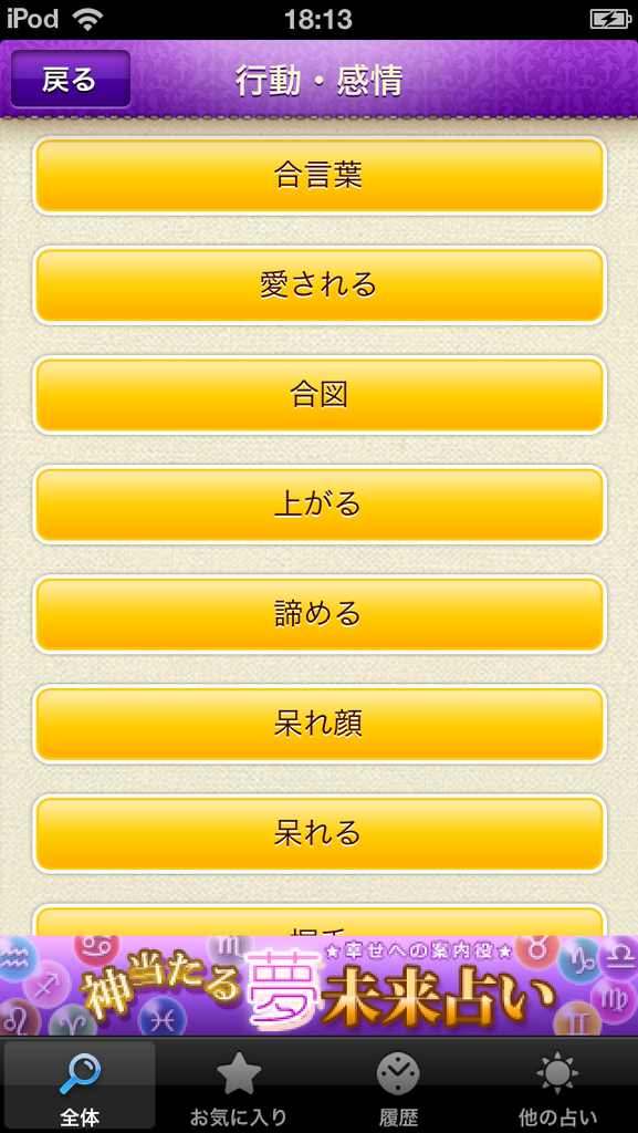 行動・感情、物、建物・場所、登場人物、人体、家具・家電・インテリア、服装・アクセサリー、イベント・趣味、風景・自然・気象、動物・生物、植物・虫、乗り物・交通、食物、色・数字・形、未知な物、その他の細かいカテゴリに分かれいるので見た夢の中の印象に残っている場面の意味を探すこともできます。