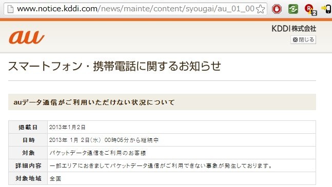 KDDIは2日、au向けのLTEサービス「4G LTE」に対応した端末において一部エリアでパケットデータ通信が2013年1月2日(水)0時05分から利用できない状況であることをお知らせしています。音声通話は問題なく利用できるとのこと。
