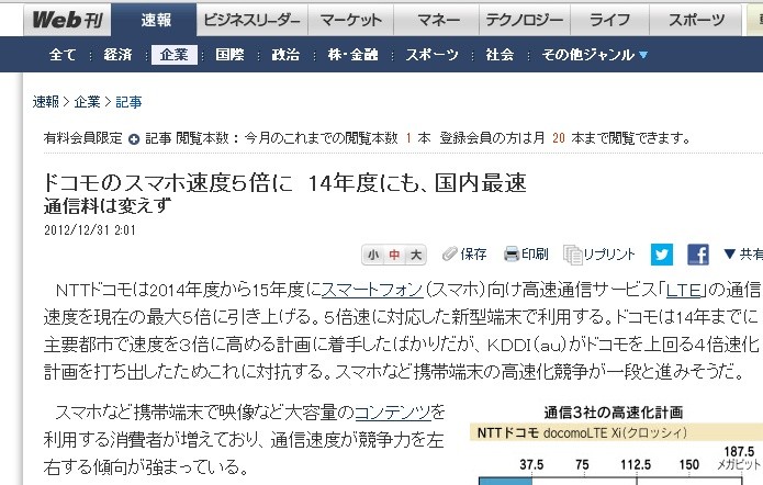 日本経済新聞は12月31日、NTTドコモが2014年度から2015年度に高速通信サービス「docomo LTE Xi」の通信速度を全国主要都市で現在の最大5倍の187.5Mbpsに引き上げると伝えています。KDDIがau向けに4倍化する計画を打ち出したため、これに対抗して高速化し、スマートフォン(スマホ)市場において優位に進めるとしています。