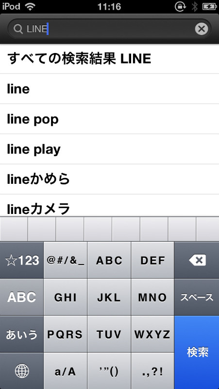 画面上部の「検索」と書かれた白い部分をタッチ。「LINE」と入力して、画面右下の「検索」をタッチします。「LINE」に関するアプリの一覧が表示されます。一番上の列をタッチします。