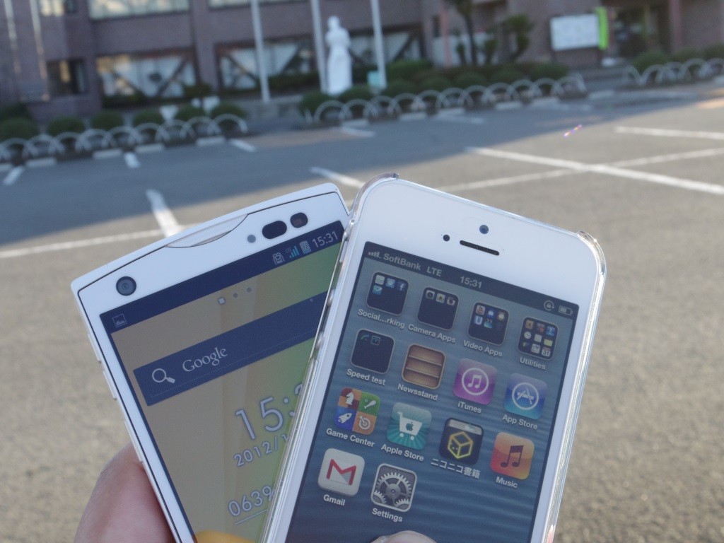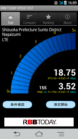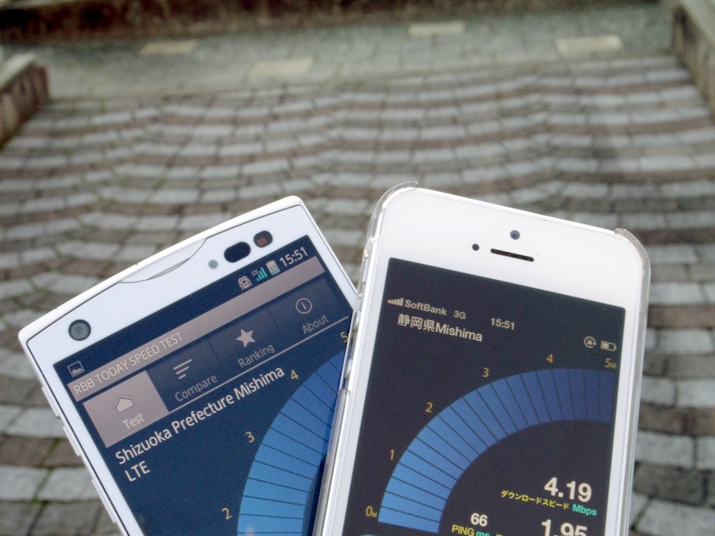 そこで、帰省ついでに長泉町と、隣接する三島市・駿東郡清水町でXiとSoftBank 4G LTEの通信テストをやってきました。使った端末は、「ARROWS V F-04E」と、「iPhone 5」です。計測はRBB TODAY Speed Test(Android版 / iOS版)を使い、各町役場・市役所前で5回ずつ行いました。