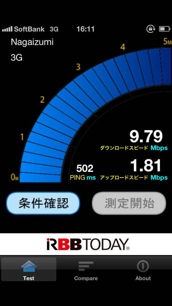 一方、SoftBank 4G LTEに関しては、1回目の計測を始めたところ、回線が切断されてしまいましたorz。その後、3Gで再接続してくれたので、気を取り直してひとまず3Gで計測してみました。