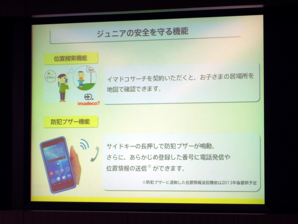 今までのキッズケータイ同様、イマドコサーチや防犯ブザーも装備されています。防犯ブザー鳴動と同時に指定した電話番号宛てに電話をかけることも可能です。ただし、発売当初は防犯ブザーと連動した位置情報送信機能には対応せず、後日対応となります。