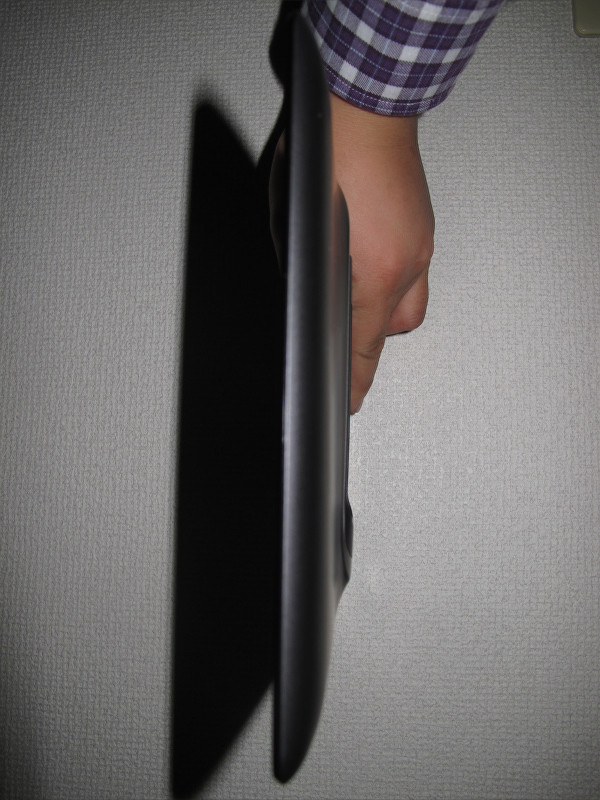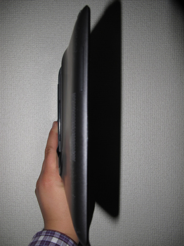 左側面にはタブレットモード時の音量キーとスピーカーがあります。両側面から見るとPadFone 2を格納する部分が、少し盛り上がっています。この盛り上がった部分がPadFone 2と合体するときのガイド部分となります。