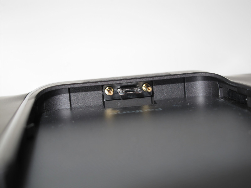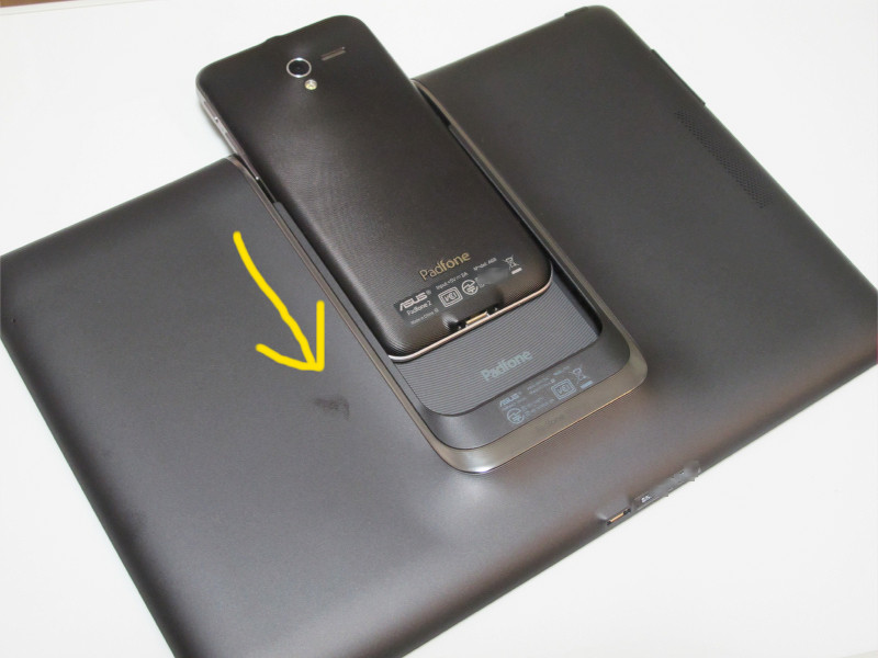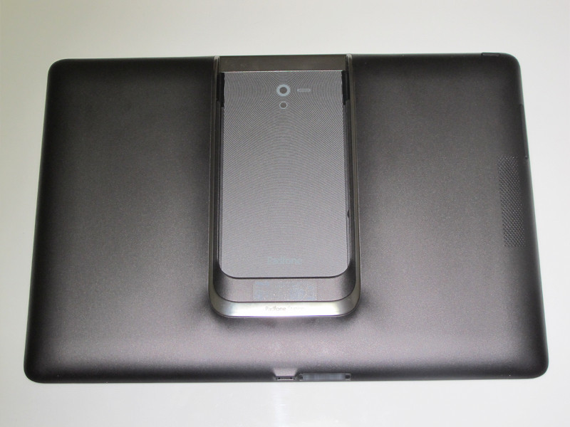 前面は10.1インチの液晶ディスプレイ(1280×800ドット)と100万画素のインカメラ、照度センサーが搭載されています。背面にはPadFone 2と合体時に格納するスペースがあり、格納スペースを覗くとPadFone 2と接続するための端子が確認できます。