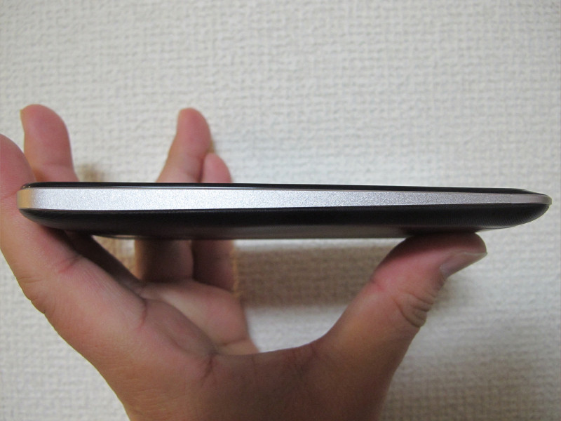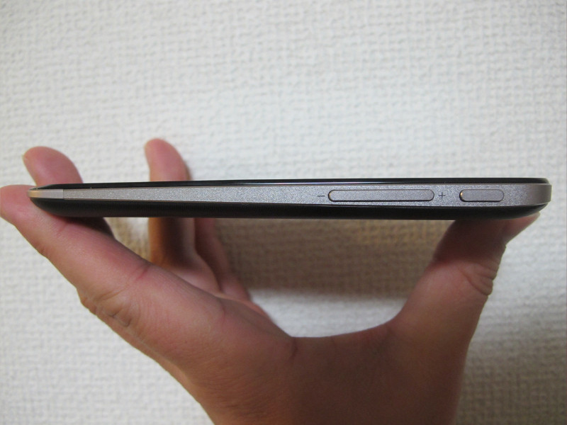 本体正面に向かって右側面には、電源ボタンとボリュームキー(上下キー)を搭載します。両側面の金属部分は底面に向かって、くさび形の加工がされていることによって、実際よりもシャープな印象を受けます。