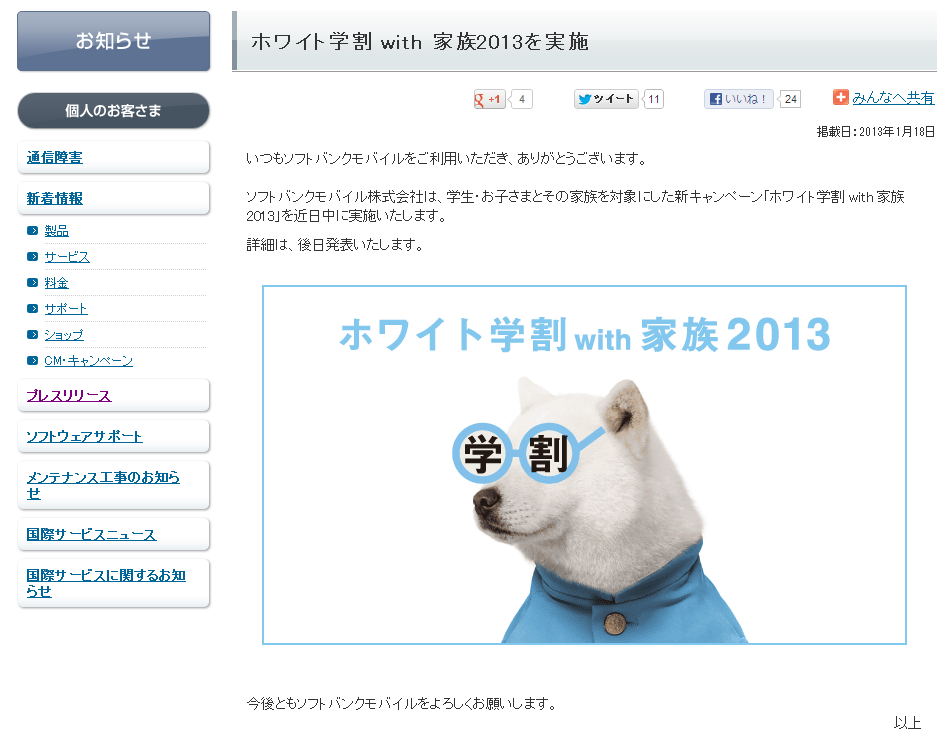・ホワイト学割 with 家族2013を実施(ソフトバンクモバイル)