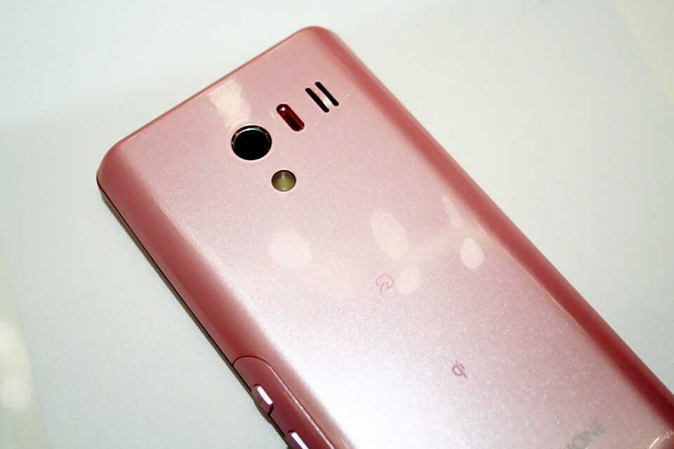 本体背面。上部にカメラなどを搭載しFeliCa、qiのロゴも見える