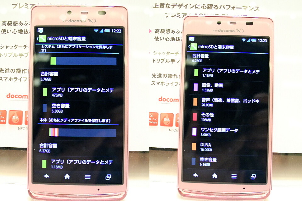 展示機ではシステム約5.3GB、本体約6.16GBの空き容量が確認できた