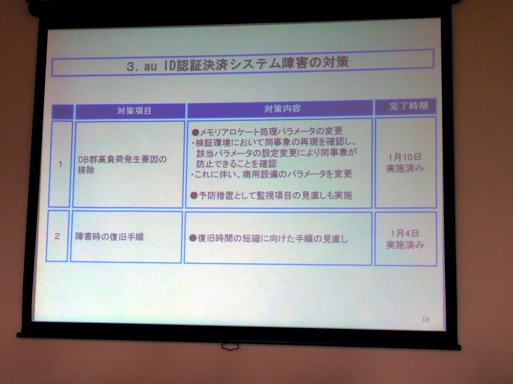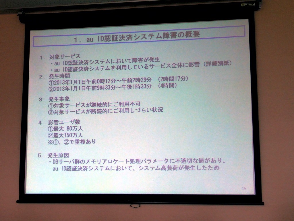 一方、元旦にはau IDの認証決済システムにおいて障害が発生しました。これについては、KDDI 新規事業統括本部 新規ビジネス推進本部長の雨宮俊武氏が説明を行いました。