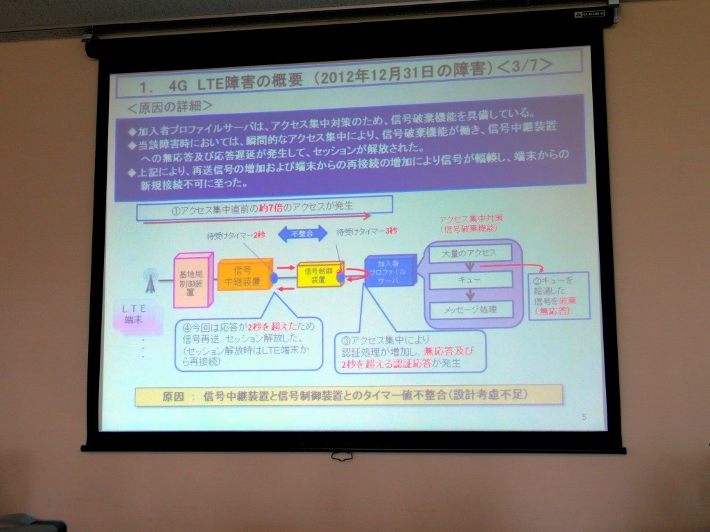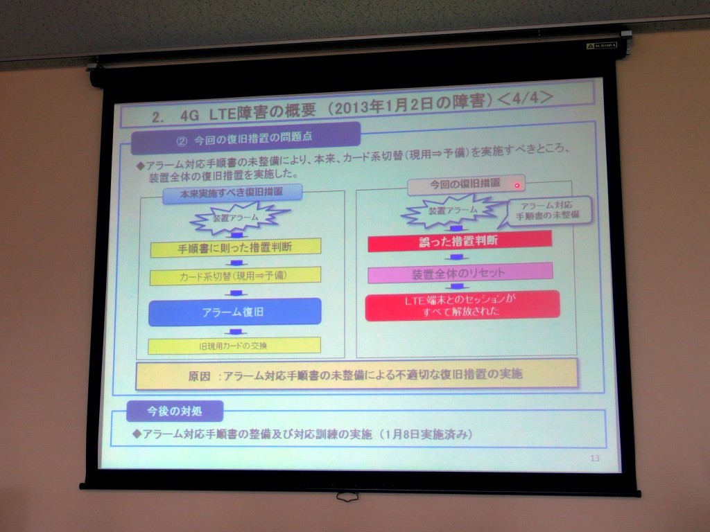 通常、アラームが鳴動した場合は、復旧手順書に従って設備を予備系に切り替えて、不具合の起こった場所を交換して…、という作業をすれば問題ありませんでしたが、今回のアラームに対する対策が手順書から抜け落ちていたことと、障害が連続していた焦りもあり、装置全体を再起動してしまいました。結果、31日の障害同様、4G LTE端末の接続が全部切断され、再接続要求を処理しきれなくなった結果、繋がりにくい状況になってしまったのです。