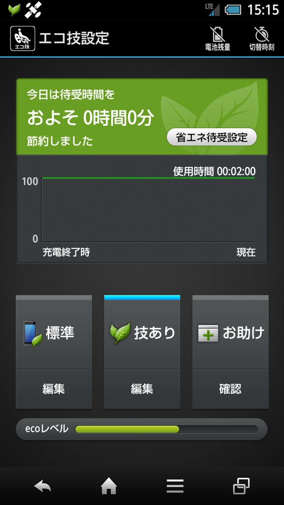 さらにバッテリー持ちを良くしたい場合は「エコ技」も使えます。以上のように「エコ技」を使わなくてもかなりバッテリーの持ちが良いのですが、さらにバッテリー消費を抑えることもできます。