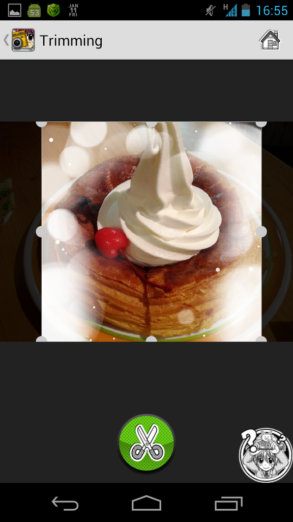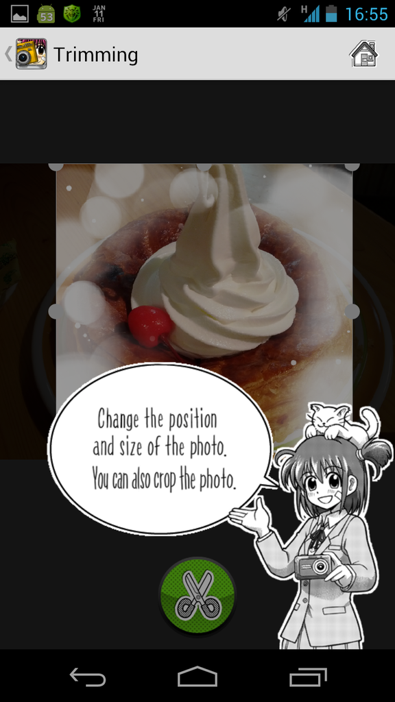 選んだ写真とフレームのプレビュー画面に切り替わり、写真のどの部分で加工するかをタップやスワイプで選びます。フレームはサイズ変更ができ、写真の一部分のみを切り抜くとこともできます。どの部分を使うかを決めたら下に有るハサミのアイコンをタップしましょう。