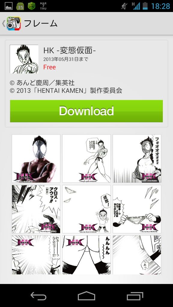 作品名をタップすればどんなフレームの確認でき、「Download」をタップしてダウンロードできます。無料フレームばかりなのでどんどんダウンロードしても良いと思いますが、現在のところフレームをアンインストール(削除)する方法が無いようです。気に入ったもの、使いそうなものだけをダウンロードしておくのがベターでしょう。