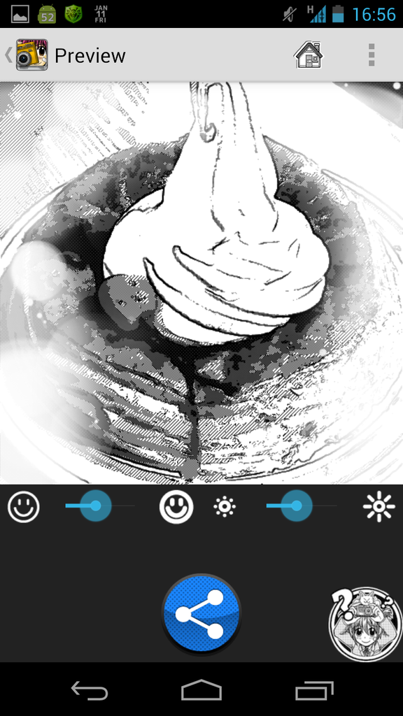 「オタクカメラ」は“漫画風”に編集できるアプリなので、ここからは白黒です。プレビュー画像下のレベル調整を左右にスライドさせて調整します。左がコントラスト、右が明るさ調整です。