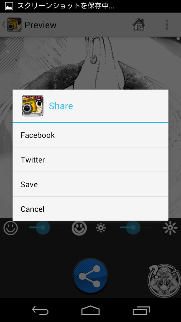 編集後は、共有アイコンをタップすることで、FacebookやTwitterに投稿することができ、「Save」で保存することもできます。