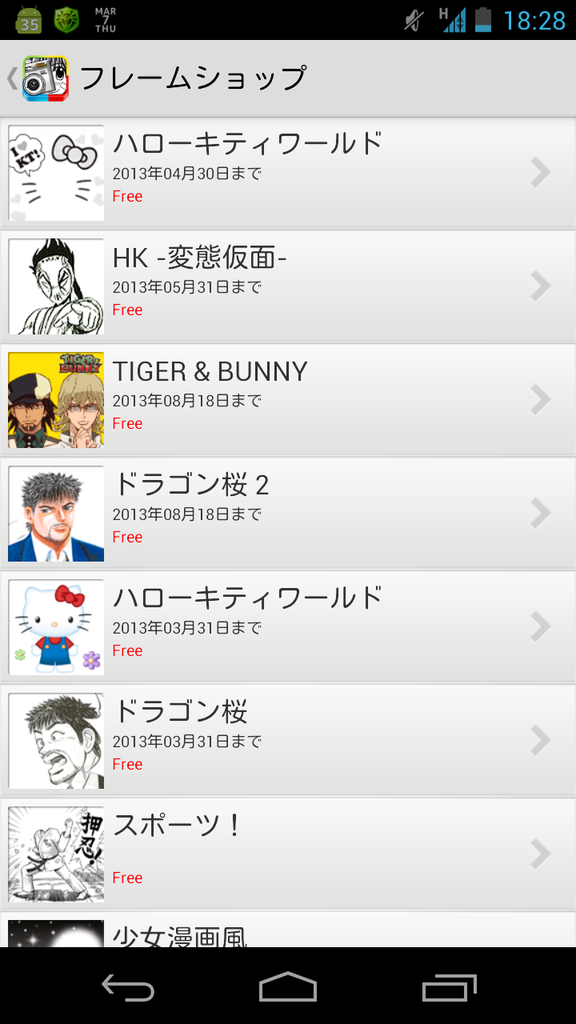 まずはトップ画面右下の「FRAME SHOP」から見ていきましょう。アプリには最初からフレームが入っていますが、漫画やキャラクターのオフィシャルフレームは「FRAME SHOP」からダウンロードする必要があります。