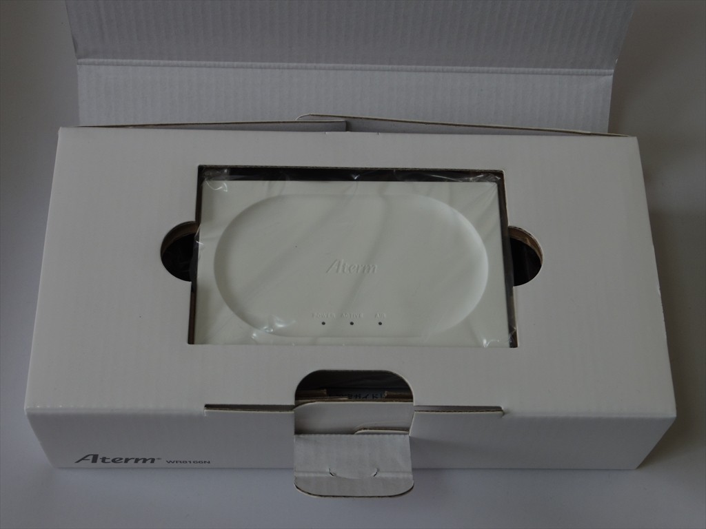 以前、とあるレンタル専用のAtermを借りた時は、何にも印刷されていないボール紙の箱に入ってきたのですが、このWR8166Nはきちんと印刷もある化粧箱に入れられています。市販品のAtermだと、機能面の特徴などなど、色々と箱に書かれているのですが、これの場合は、そういうものは一切なく、本体の写真、Atermロゴ、機種名しか印字されていない超シンプルな感じです。NECロゴはもちろんのこと、ドコモロゴもどこにも見当たりません。個人的には、この箱を見た瞬間が一番の驚きでしたw