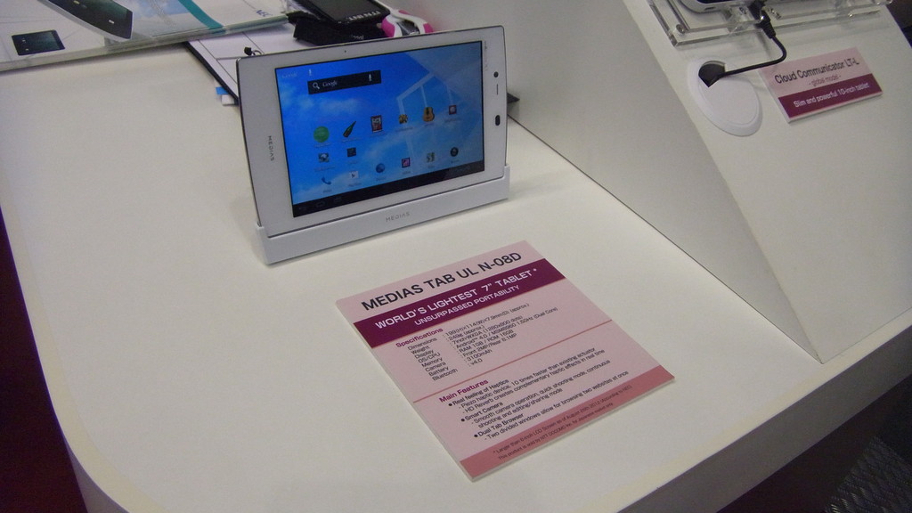 この他、日本国内でドコモ向けに発売済みのMEDIAS TAB ULも世界最軽量7インチタブレットとして展示されており、ハプティクス技術とともに手にした来場者が関心を示していた。